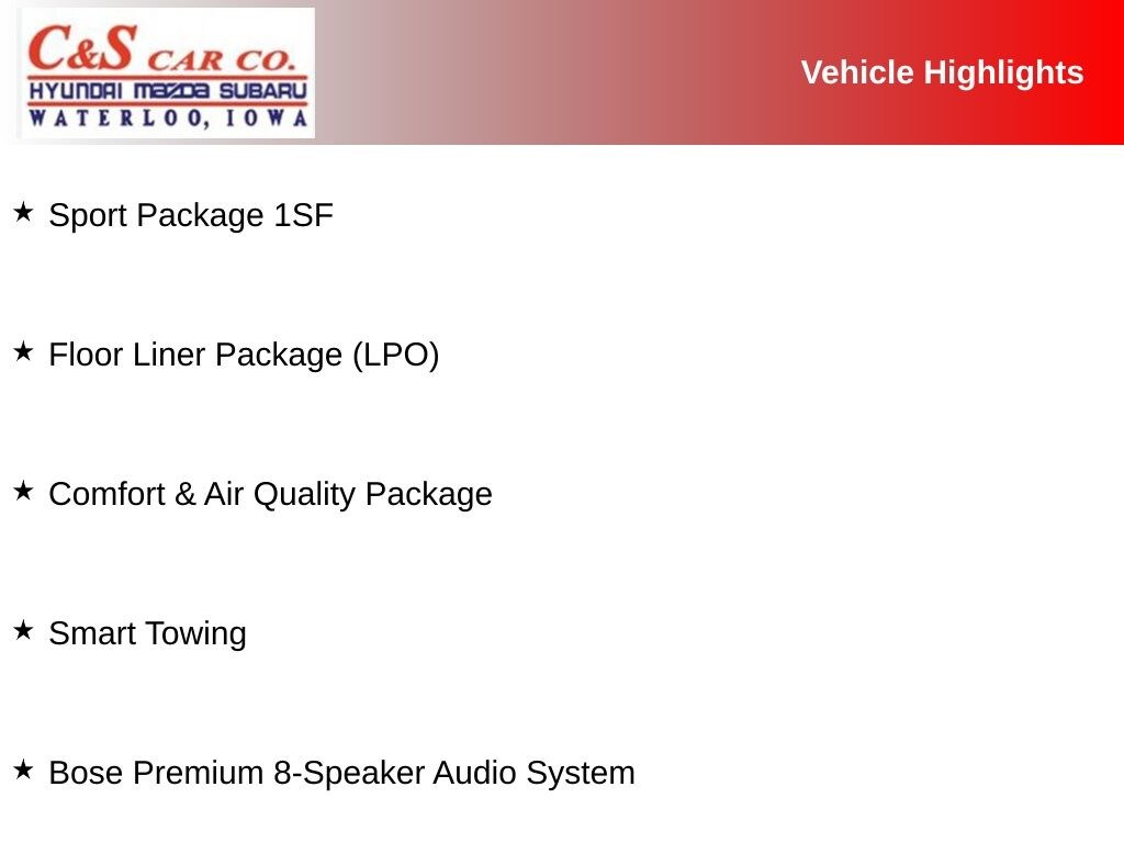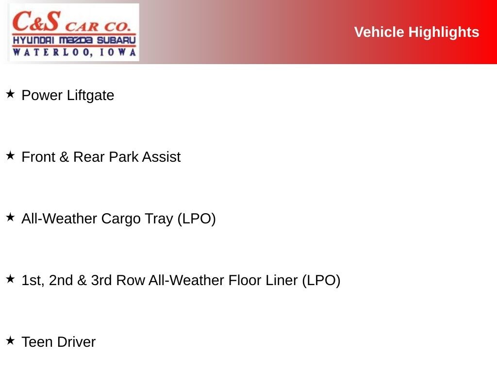 1st, 2nd & 3rd Row All-Weather Floor Liner (LPO), 2-Way Power Driver Lumbar Control Seat Adjuster, 2-Way Power Passenger Lumbar Control Seat Adjuster, 3rd row seats: split-bench, 6-Passenger Seating, Air Ionizer, All-Weather Cargo Tray (LPO), AppLink/Apple CarPlay and Android Auto, Audio memory, Automatic Emergency Braking, Bose Premium 8-Speaker Audio System, Comfort & Air Quality Package, Driver & Front Passenger Heated Seats, Floor Liner Package (LPO), Front & Rear Park Assist, Front Bucket Seats, Front Center Armrest, Heated front seats, Heated Rear Outboard Seating Positions, Hitch Guidance, Hitch Guidance w/Hitch View, Leather Seating Surfaces w/Mini-Perforated Inserts, Memory seat, Power driver seat, Power Liftgate, Power moonroof: UltraView, Power passenger seat, Smart Towing, Split folding rear seat, Sport Package 1SF, Teen Driver, Ventilated Driver & Front Passenger Seats, Wheels: 20" 12-Spoke Alloy w/Pearl Nickel Finish.