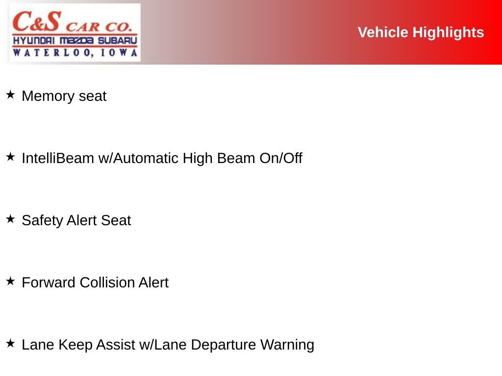 18" x 8.5" High-Polished Aluminum Finish Wheels, 6-Way Power Front Passenger Seat Adjuster, Automatic Emergency Braking, Enhanced Driver Alert Package, Forward Collision Alert, IntelliBeam w/Automatic High Beam On/Off, Lane Keep Assist w/Lane Departure Warning, Memory seat, Pedal memory, Power driver seat, Premium Smooth Ride Suspension Package, Rain sensing wipers, Safety Alert Seat.