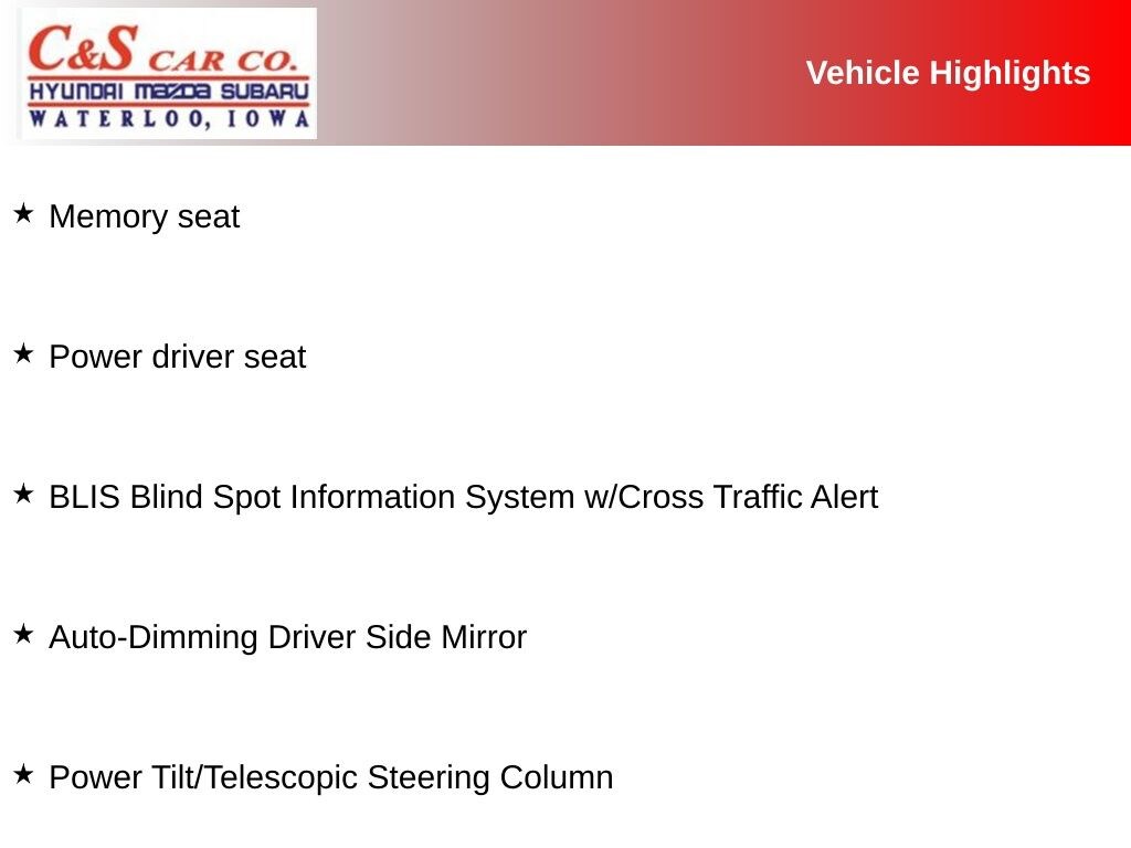 Elevate your driving experience with the premium Sony audio system and HD Radio, providing crystal-clear sound quality and a wide range of entertainment options. The power tilt/telescoping steering column and memory-equipped driver's seat ensure a personalized and comfortable driving position every time you get behind the wheel.