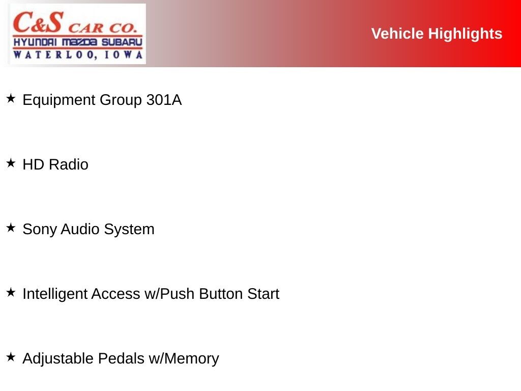 - 301A Equipment Group including heated and cooled front seats, HD Radio, Sony audio system, power tilt/telescoping steering column, auto-dimming driver's side mirror, power adjustable pedals with memory, Blind Spot Information System (BLIS) with cross-traffic alert, and intelligent access with push-button start