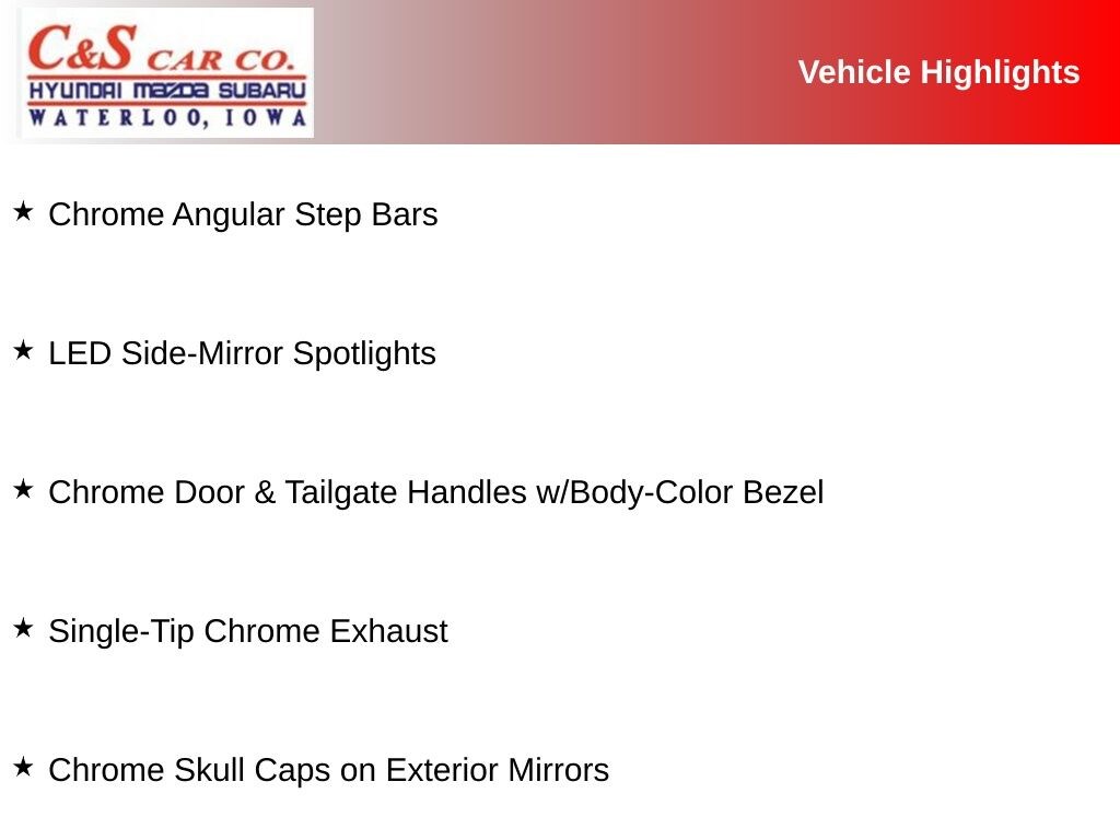 - Lariat Chrome Appearance Package: Elevate your presence on the road with chrome accents including a 3-bar grille, angular step bars, door handles, and mirror caps.
