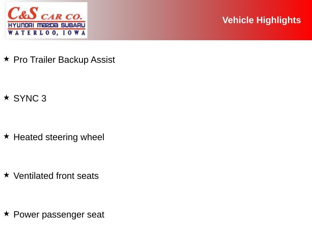 20" Polished Aluminum Wheels, Class IV Trailer Hitch Receiver, Engine Oil Cooler, Equipment Group 700A Base, GVWR: 7,050 lbs Payload Package, Heated front seats, Heated rear seats, Heated steering wheel, Memory seat, Navigation System, Pedal memory, Power driver seat, Power passenger seat, Pro Trailer Backup Assist, Split folding rear seat, SYNC 3, Trailer Tow Package, Twin Panel Moonroof, Upgraded Front Stabilizer Bar, Ventilated front seats.