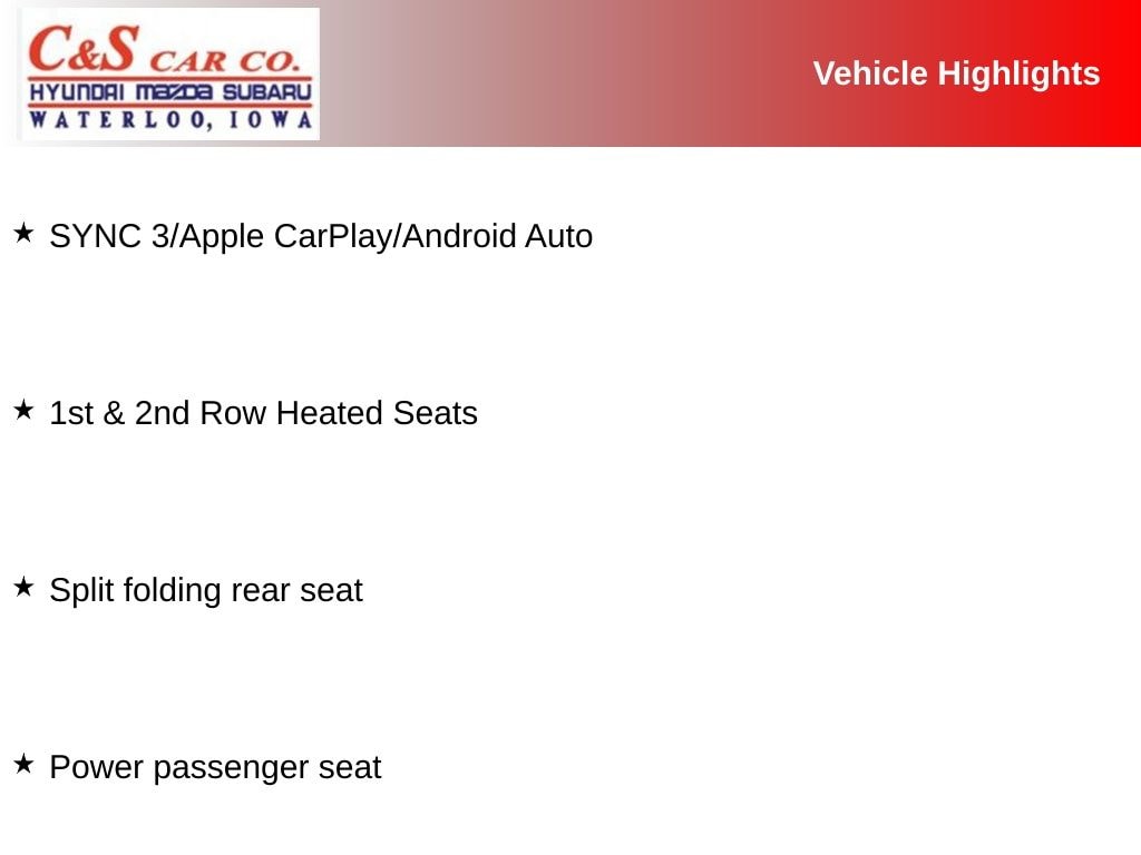 - Smart device integration: SYNC 3/Apple CarPlay/Android Auto