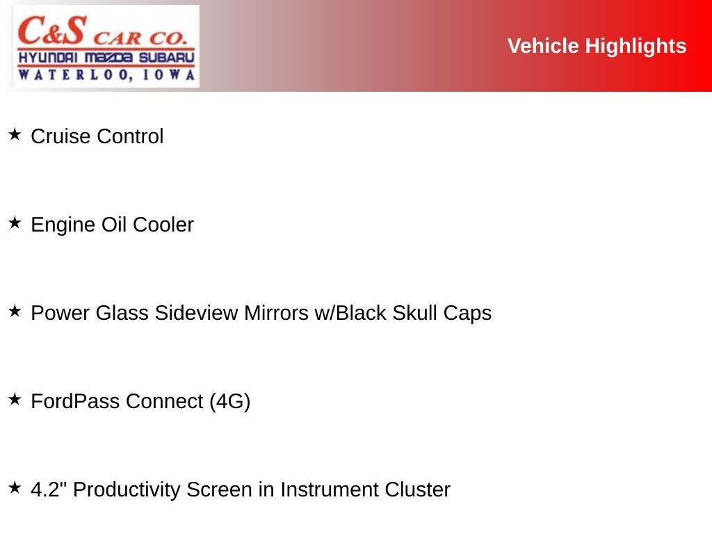 4.2" Productivity Screen in Instrument Cluster, Class IV Trailer Hitch Receiver, Cruise Control, Engine Oil Cooler, Equipment Group 101A Mid, Extended Range 36 Gallon Fuel Tank, FordPass Connect (4G), Illuminated Entry, Integrated Trailer Brake Controller, Max Trailer Tow Package, MyKey, Perimeter Alarm, Power Door Locks, Power Front & Rear Windows, Power Glass Sideview Mirrors w/Black Skull Caps, Power Tailgate Lock, SYNC, Upgraded Front Stabilizer Bar, Wheels: 17" Silver Steel, XL Power Equipment Group.