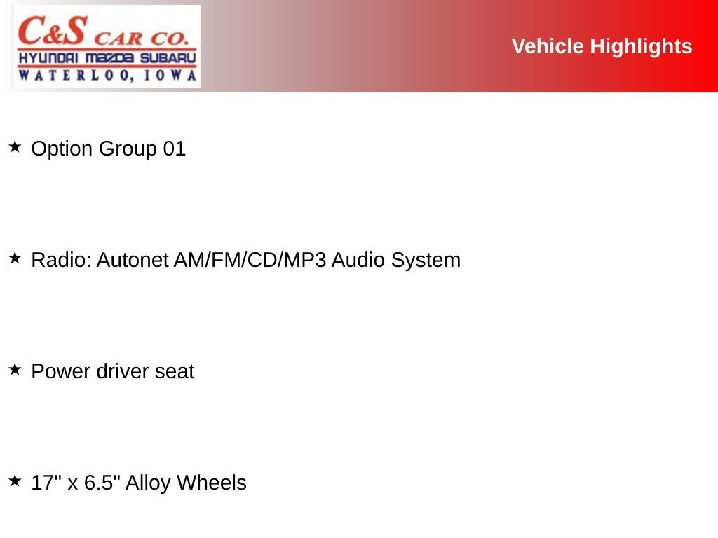 17" x 6.5" Alloy Wheels, Option Group 01, Power driver seat, Radio: Autonet AM/FM/CD/MP3 Audio System.