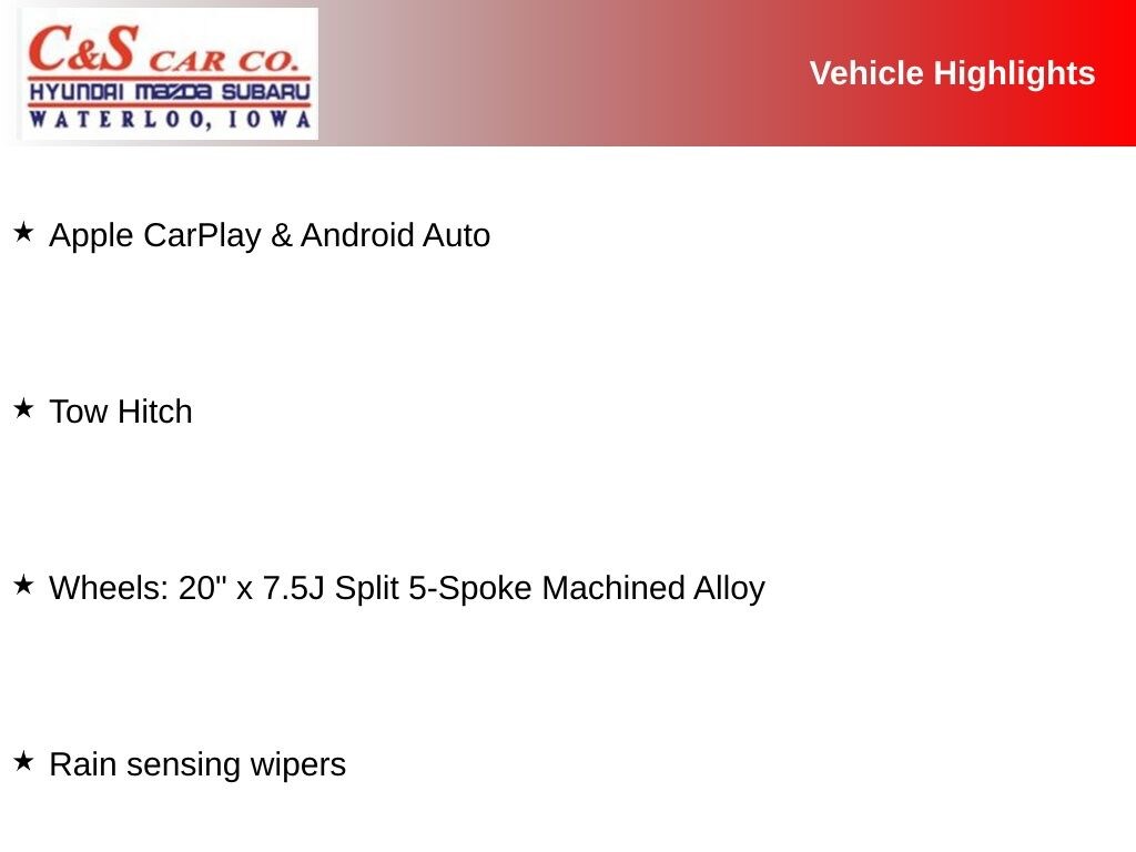 Apple CarPlay & Android Auto, Bumper Applique, harman/kardon® Speakers, Heads-Up Display, Heated steering wheel, Memory seat, Navigation System, Option Group 01, Power driver seat, Power Liftgate, Power moonroof, Rain sensing wipers, Tow Hitch, Wheels: 20" x 7.5J Split 5-Spoke Machined Alloy.