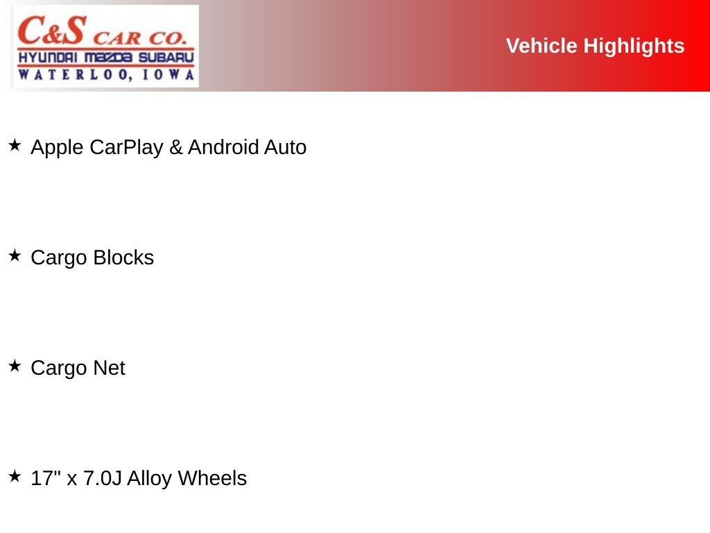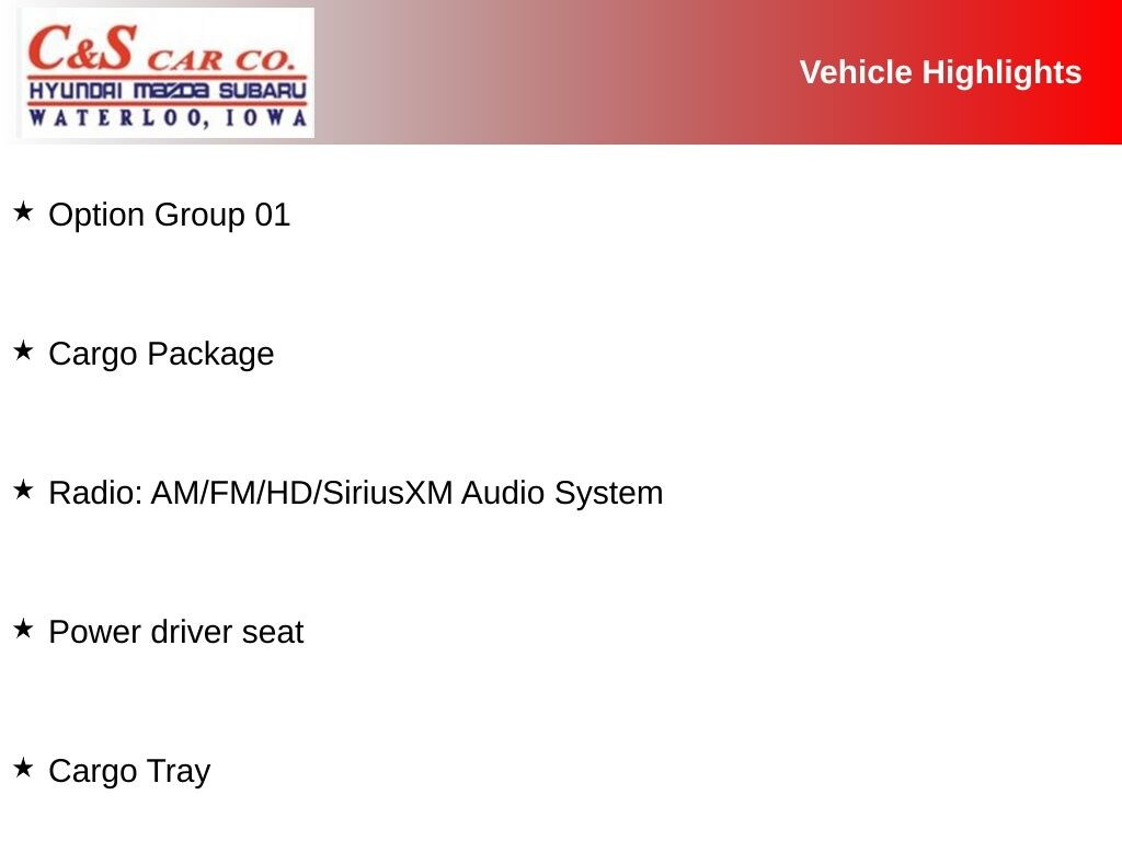 17" x 7.0J Alloy Wheels, Apple CarPlay & Android Auto, Cargo Blocks, Cargo Net, Cargo Package, Cargo Tray, Option Group 01, Power driver seat, Radio: AM/FM/HD/SiriusXM Audio System.
