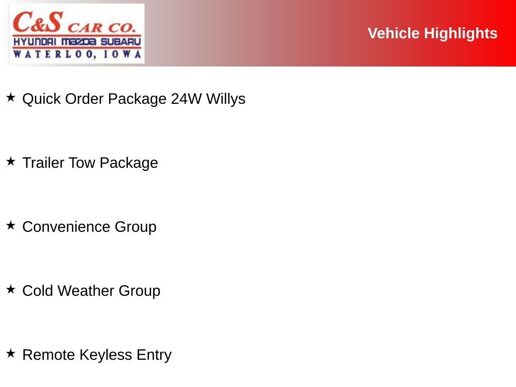 Designed with the outdoor enthusiast in mind, the Gladiator Willys is packed with features that elevate your driving experience. Enjoy the convenience of the Convenience Group, which includes a universal garage door opener, speed-sensitive power locks, and a leather-wrapped steering wheel. The Cold Weather Group ensures you stay cozy even in the harshest conditions, with a heated steering wheel and heated front seats.