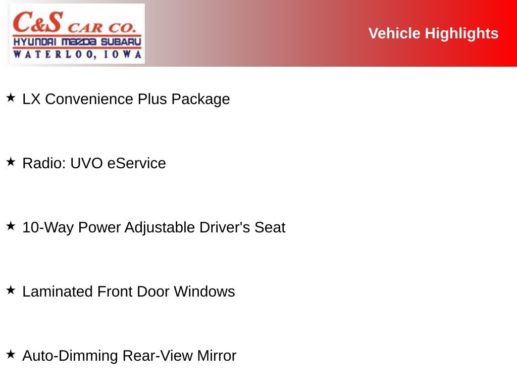 10-Way Power Adjustable Driver's Seat, 16" Alloy Wheels, Auto-Dimming Rear-View Mirror, Laminated Front Door Windows, LX Convenience Plus Package, Radio: UVO eService, Rear Camera Display.