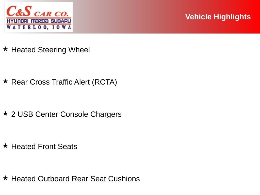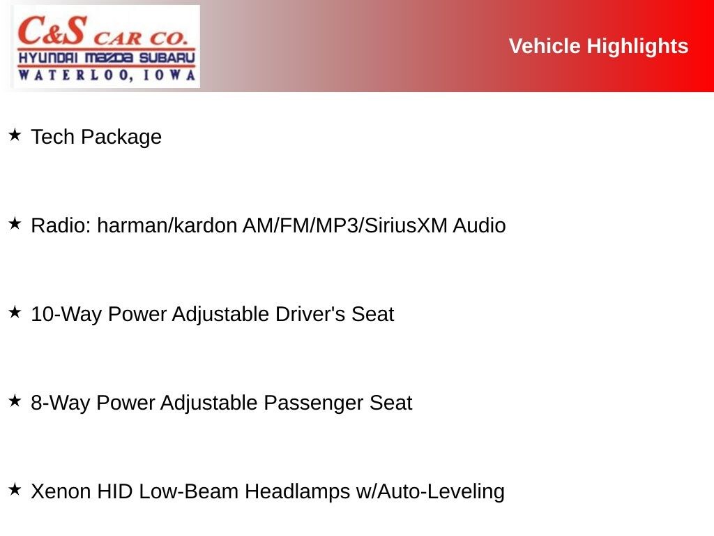 10-Way Power Adjustable Driver's Seat, 2 USB Center Console Chargers, 8-Way Power Adjustable Passenger Seat, Blind Spot Detection (BSD), Heated Front Seats, Heated Outboard Rear Seat Cushions, Heated Steering Wheel, LED Front Fog Lights, LED Positioning Lights, LED Tail Light & CHMSL, Power-Folding Exterior Mirrors, Radio: harman/kardon AM/FM/MP3/SiriusXM Audio, Rear Cross Traffic Alert (RCTA), Tech Package, Xenon HID Low-Beam Headlamps w/Auto-Leveling.
