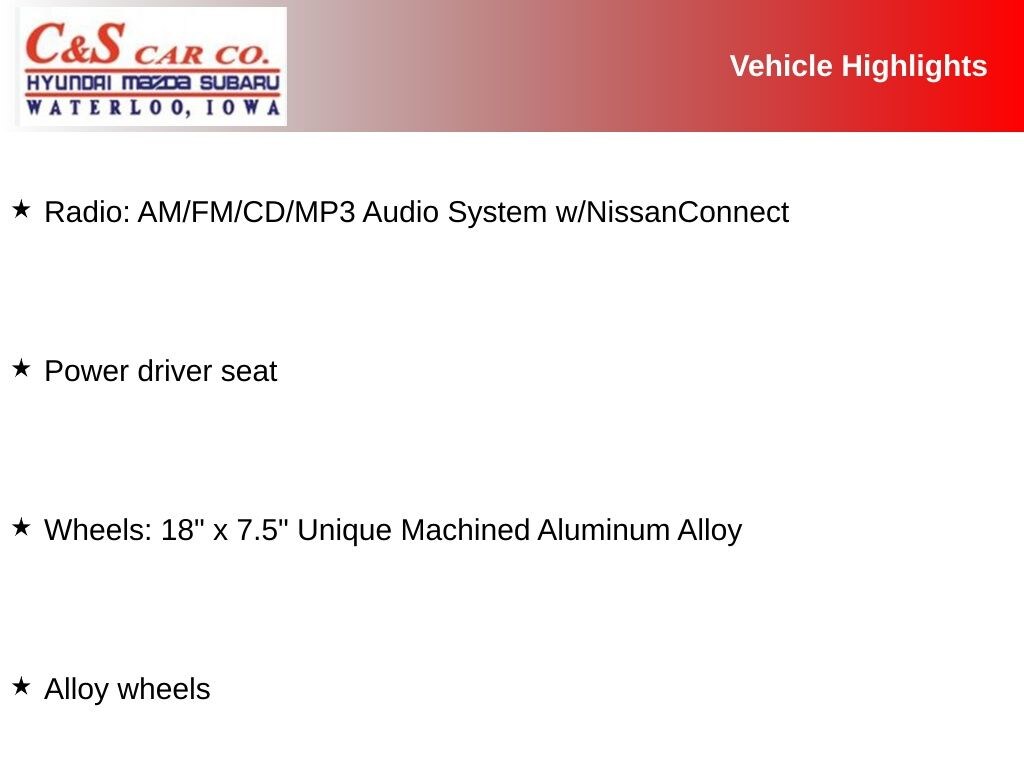 Alloy wheels, Power driver seat, Radio: AM/FM/CD/MP3 Audio System w/NissanConnect, Wheels: 18" x 7.5" Unique Machined Aluminum Alloy.