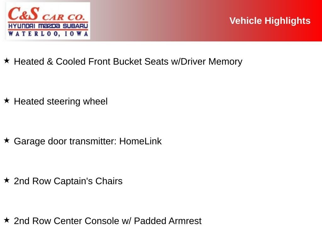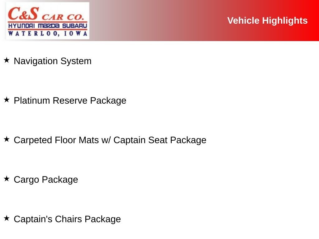 13 Speakers, 2nd Row Captain's Chairs, 2nd Row Center Console w/ Padded Armrest, Captain's Chairs Package, Cargo Package, Carpeted Floor Mats w/ Captain Seat Package, Front Center Armrest, Garage door transmitter: HomeLink, Heated & Cooled Front Bucket Seats w/Driver Memory, Heated front seats, Heated rear seats, Heated steering wheel, Leather-Appointed Seat Trim, Memory seat, Navigation System, Platinum Reserve Package, Power driver seat, Power Liftgate, Power moonroof, Power passenger seat, Reclining 3rd row seat, Split folding rear seat, Two-Tone Semi-Aniline Leather Seat Trim, Variably intermittent wipers, Ventilated front seats, Wheels: 20" Dark Chrome Alloy, Wheels: 20" Machine-Faced Chrome w/Tinted CC.