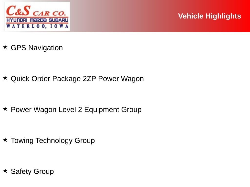 With its powerful 6.4L HEMI V8 engine, 4-wheel drive, and off-road-focused suspension, the Power Wagon is ready to tackle any terrain. The RamBox Cargo Management System provides secure and accessible storage, while the Towing Technology Group ensures you can tow with confidence. The Tri-Fold Tonneau Cover and Spray-in Bedliner protect your cargo, while the premium features like the Harman Kardon sound system and Uconnect infotainment system keep you entertained and connected on the go.