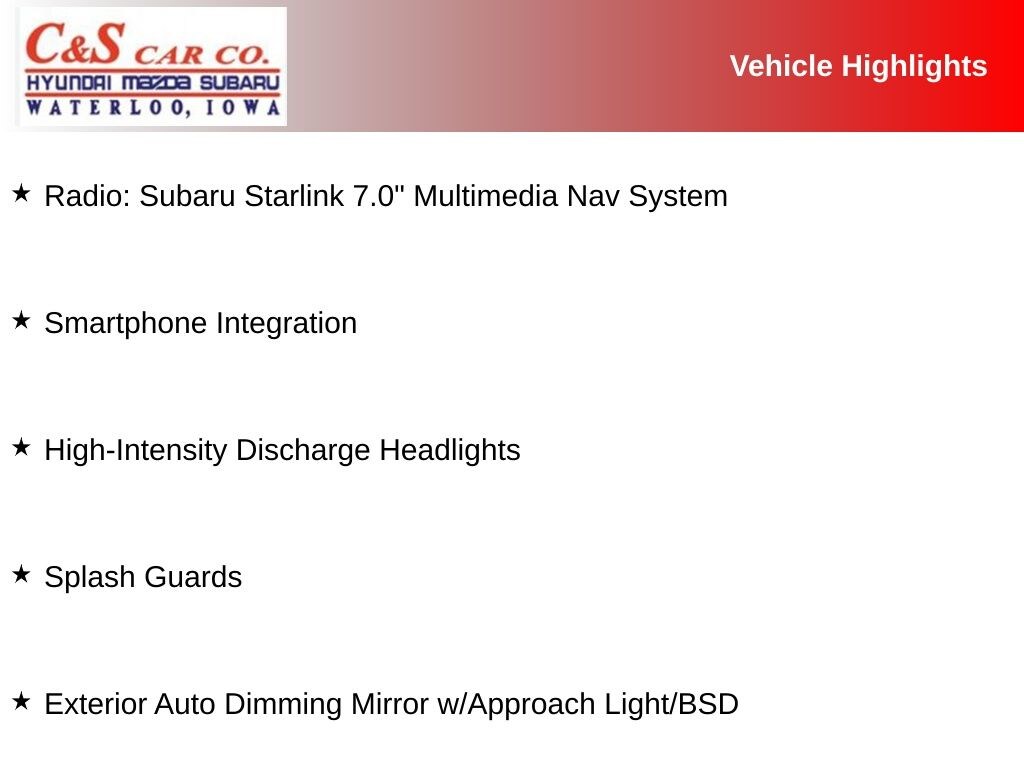 - Radio: Subaru Starlink 7.0" Multimedia Nav System
