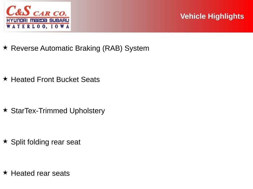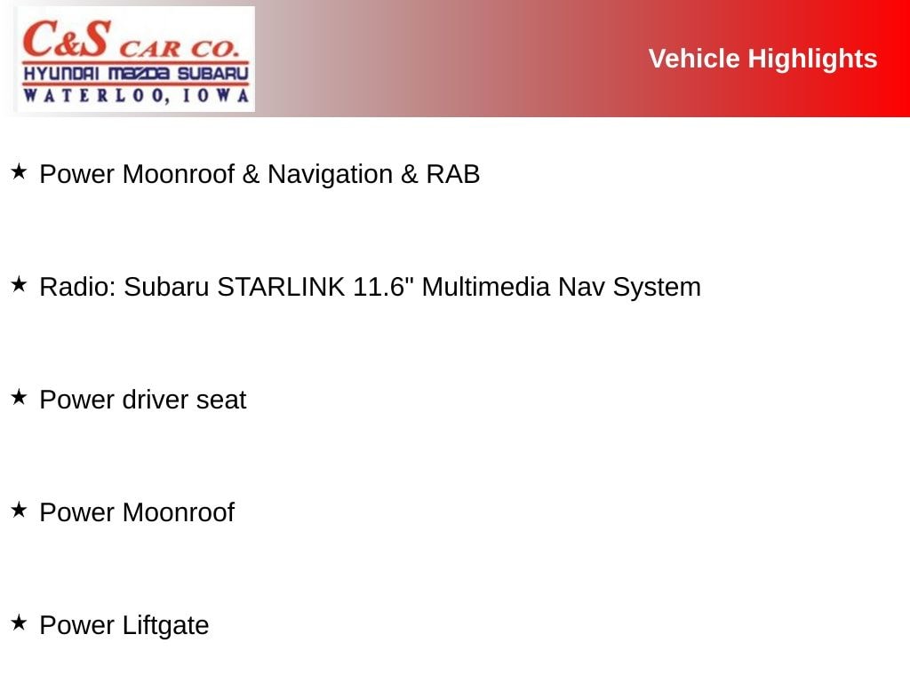 Alloy wheels, Heated Front Bucket Seats, Heated front seats, Heated rear seats, Power driver seat, Power Liftgate, Power Moonroof, Power Moonroof & Navigation & RAB, Power passenger seat, Radio: Subaru STARLINK 11.6" Multimedia Nav System, Reverse Automatic Braking (RAB) System, Split folding rear seat, StarTex-Trimmed Upholstery, Wheels: 17" x 7J Black Aluminum Alloy.
