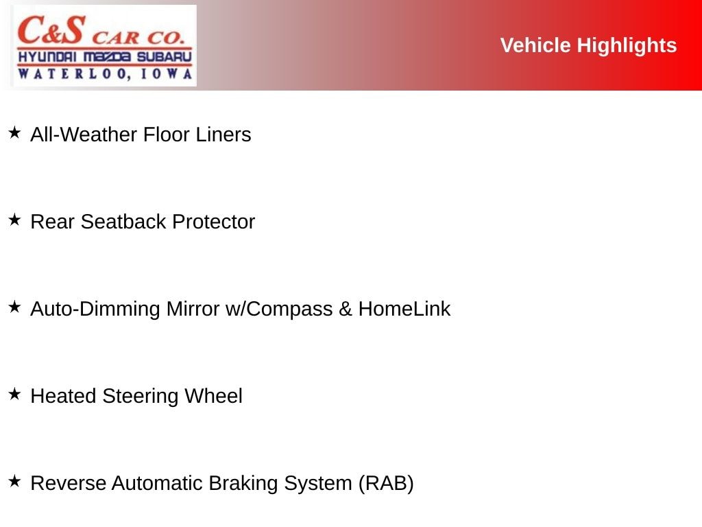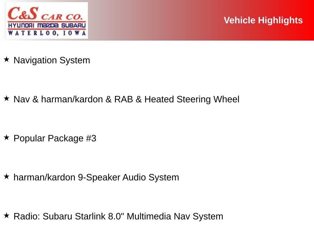 All-Weather Floor Liners, Alloy wheels, Auto-Dimming Exterior Mirror w/Approach Light, Auto-Dimming Mirror w/Compass & HomeLink, harman/kardon 9-Speaker Audio System, Heated Steering Wheel, Nav & harman/kardon & RAB & Heated Steering Wheel, Navigation System, Popular Package #3, Power driver seat, Power Liftgate, Power moonroof: Panoramic, Radio: Subaru Starlink 8.0" Multimedia Nav System, Rear Bumper Cover, Rear Seatback Protector, Reverse Automatic Braking System (RAB), Wheels: 18" x 7.0 J Black Machine Finish Alloy.